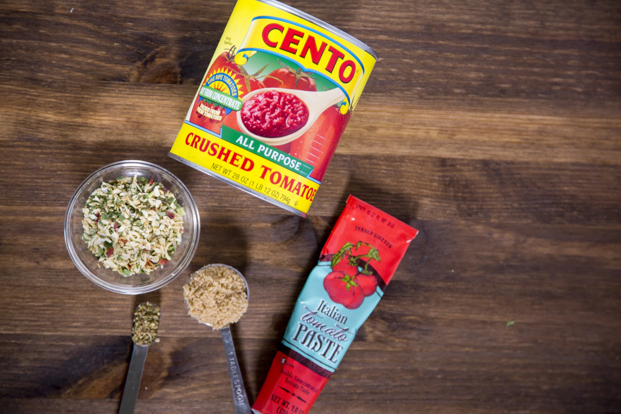 - Add crushed tomatoes, brown sugar and oregano.